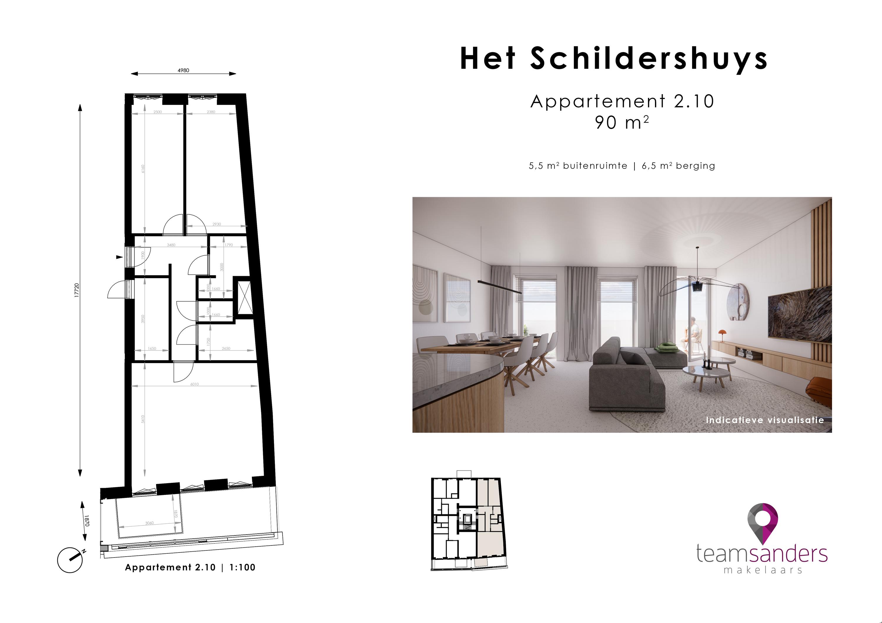 Appartement 2.10 in Het Schildershuys is een modern en sfeervol appartement op de tweede verdieping, ontworpen met aandacht voor comfort en eigentijds wonen. Met een woonoppervlakte van 90 m² en een praktische indeling biedt dit appartement een fijne leefomgeving voor wie op zoek is naar gelijkvloers, licht en comfortabel wonen. De grote raampartijen in de woonkamer zorgen voor een open en ruimtelijk gevoel, terwijl de buitenruimte van 5,5 m² een mooie plek biedt om buiten te zitten.