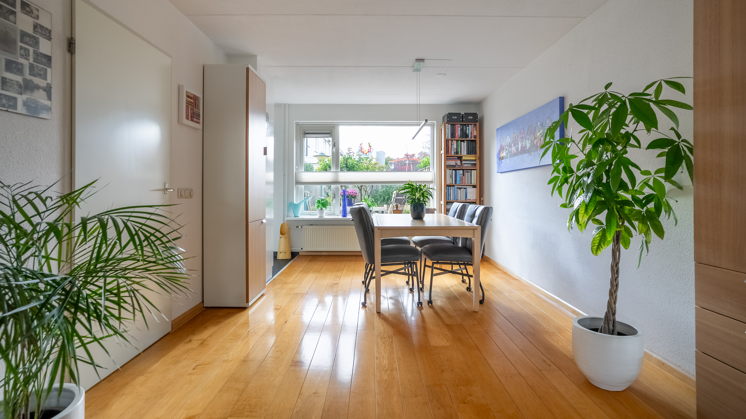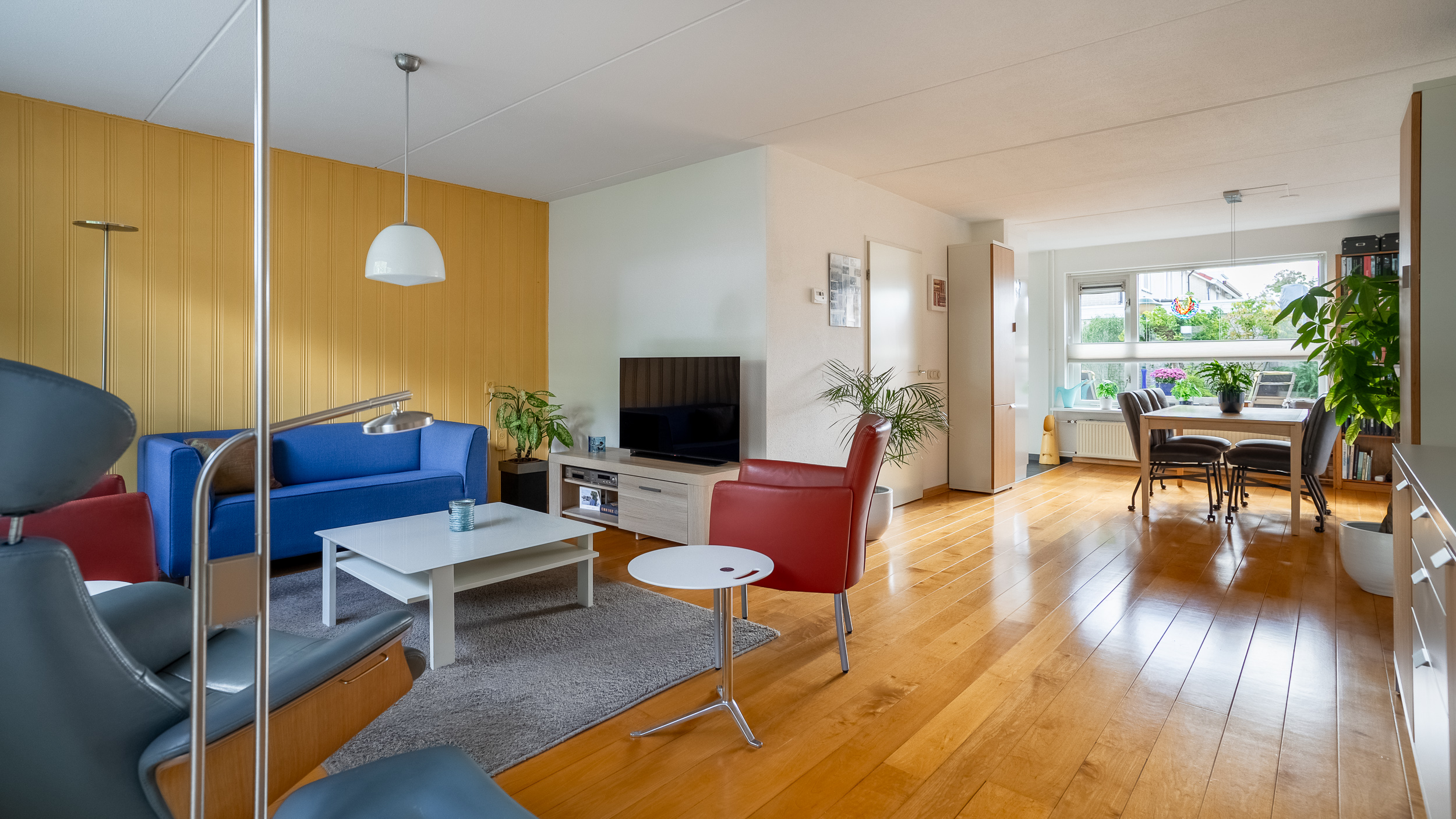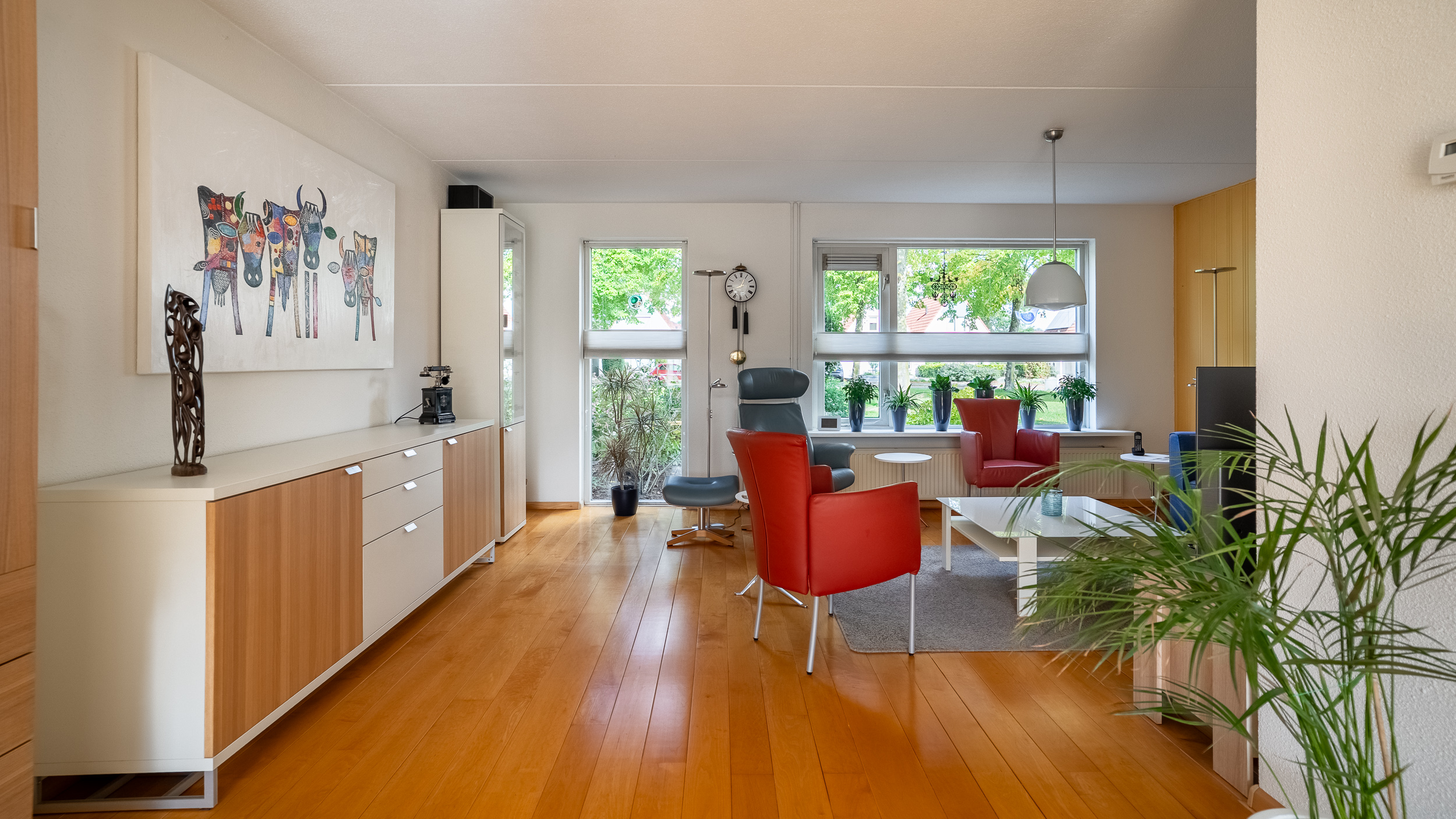 Entree, hal, toiletruimte, trapopgang, meterkast, ruime L-vormige woonkamer met vrij uitzicht, moderne open keuken met inbouwapparatuur en deur naar achtertuin, aansluitend de ruime garage.