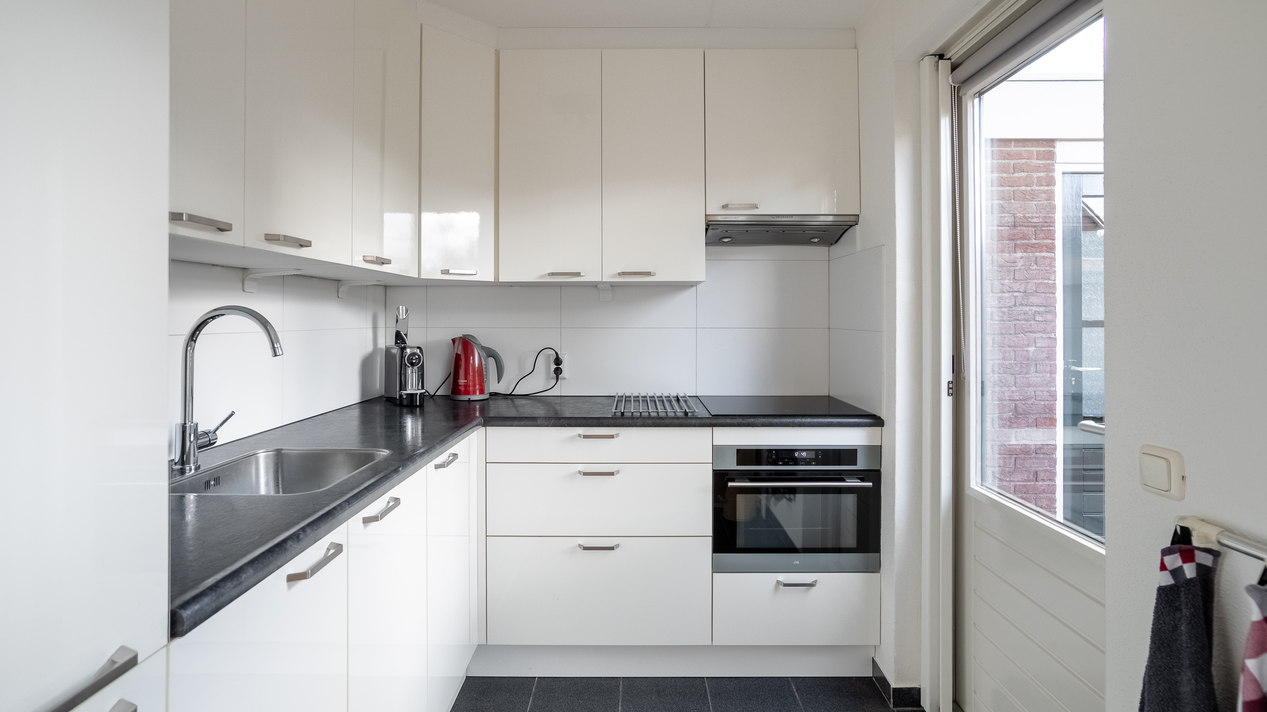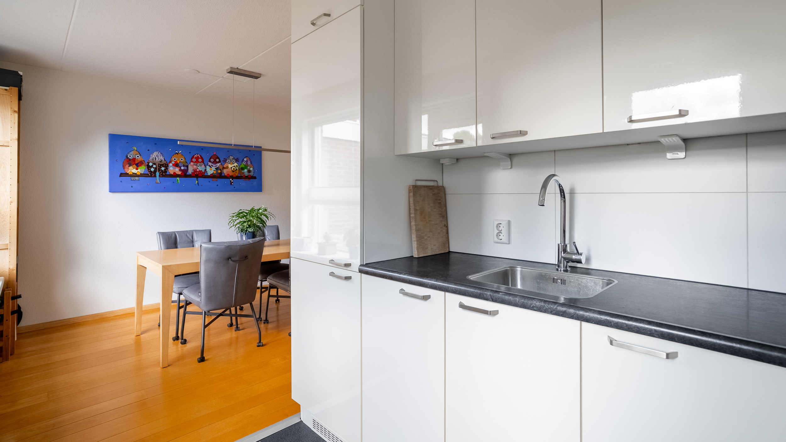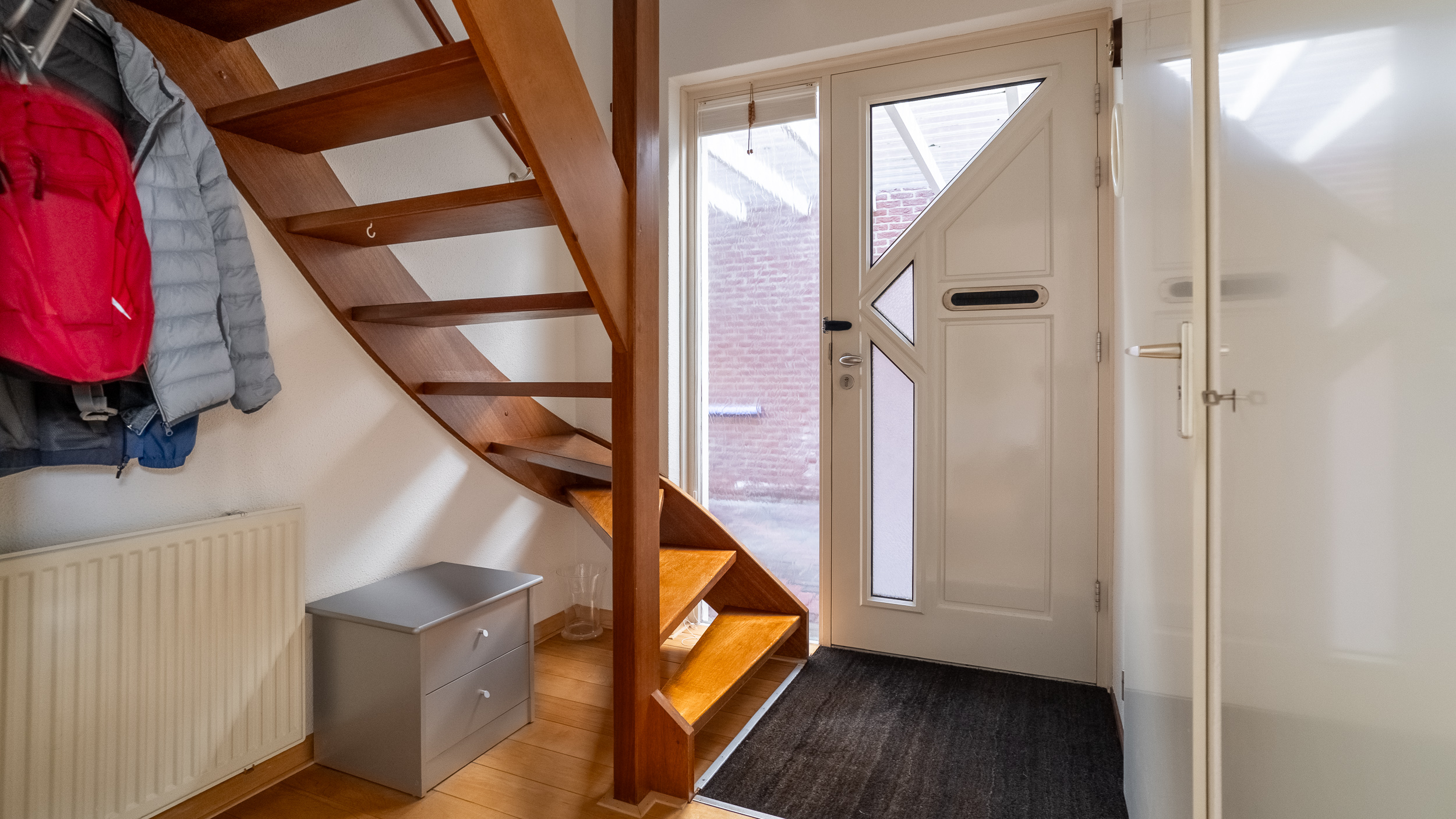 Entree, hal, toiletruimte, trapopgang, meterkast, ruime L-vormige woonkamer met vrij uitzicht, moderne open keuken met inbouwapparatuur en deur naar achtertuin, aansluitend de ruime garage.