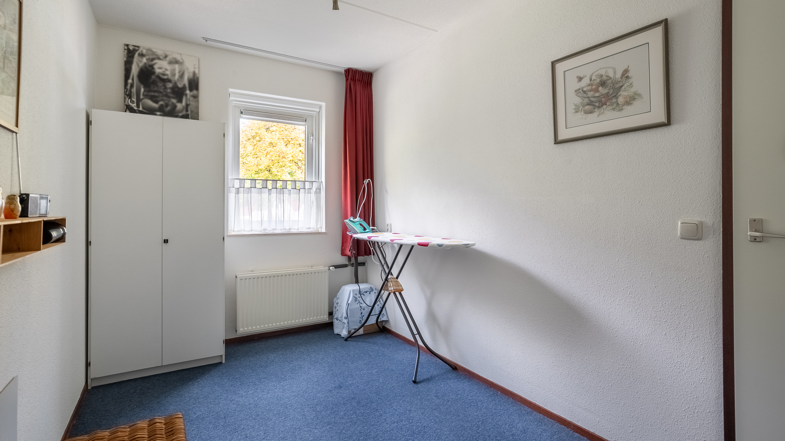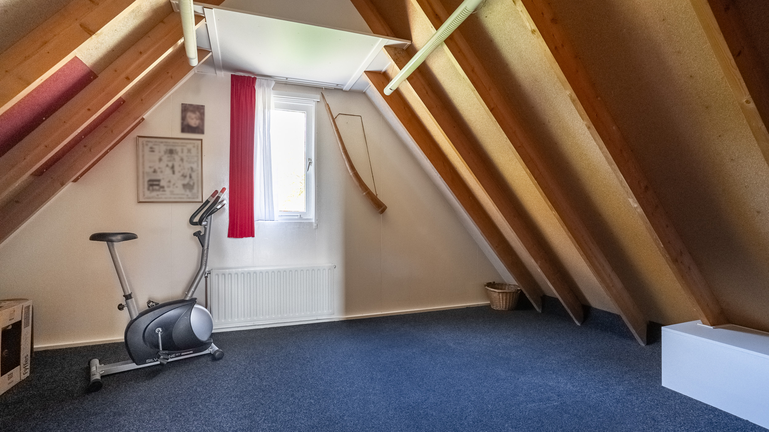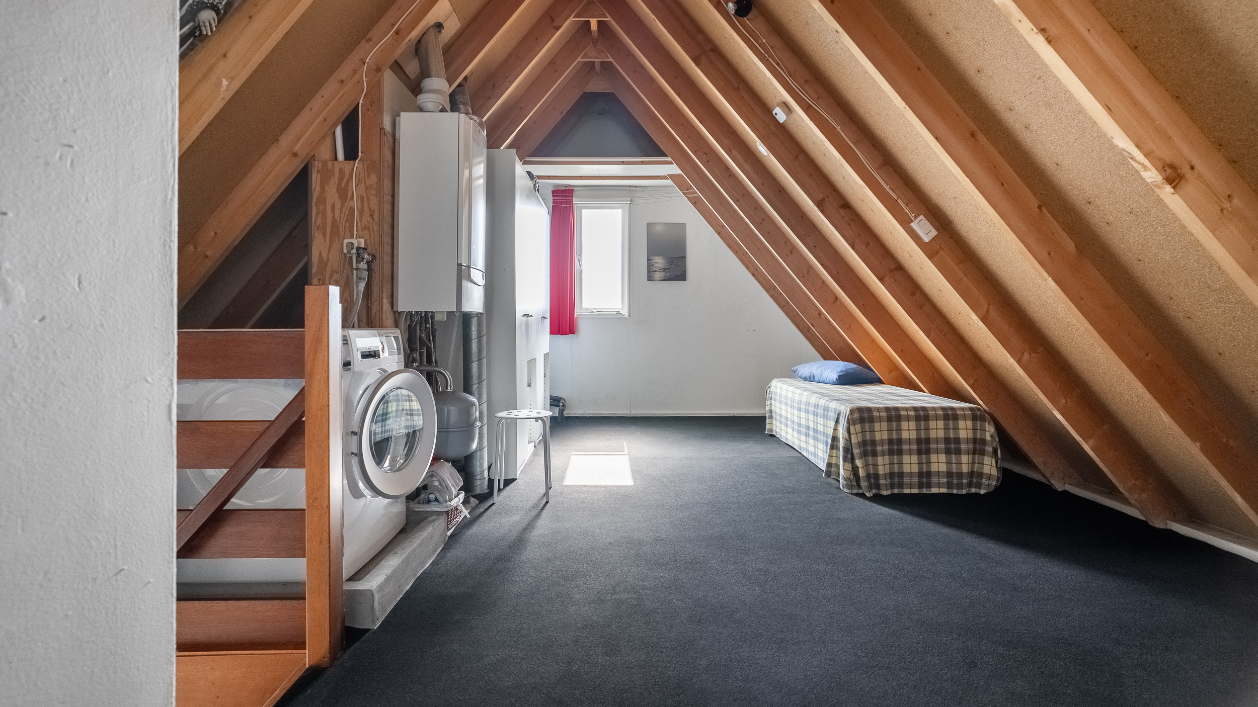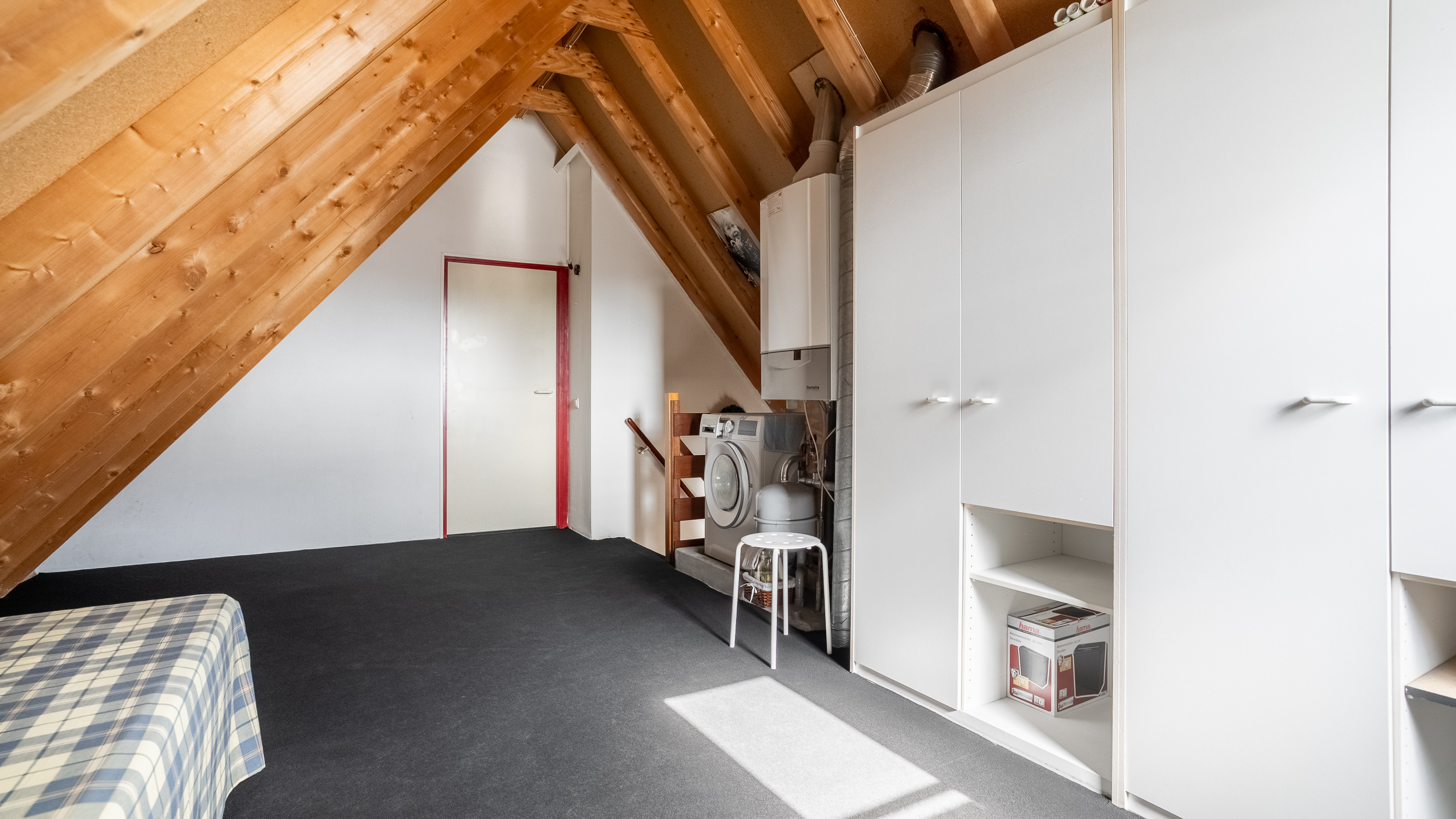 Overloop naar grote voorzolder met opstelplaats cv-ketel en witgoedapparatuur, ruime slaapkamer met vaste kast en voldoende bergruimte achter de schuine kanten.