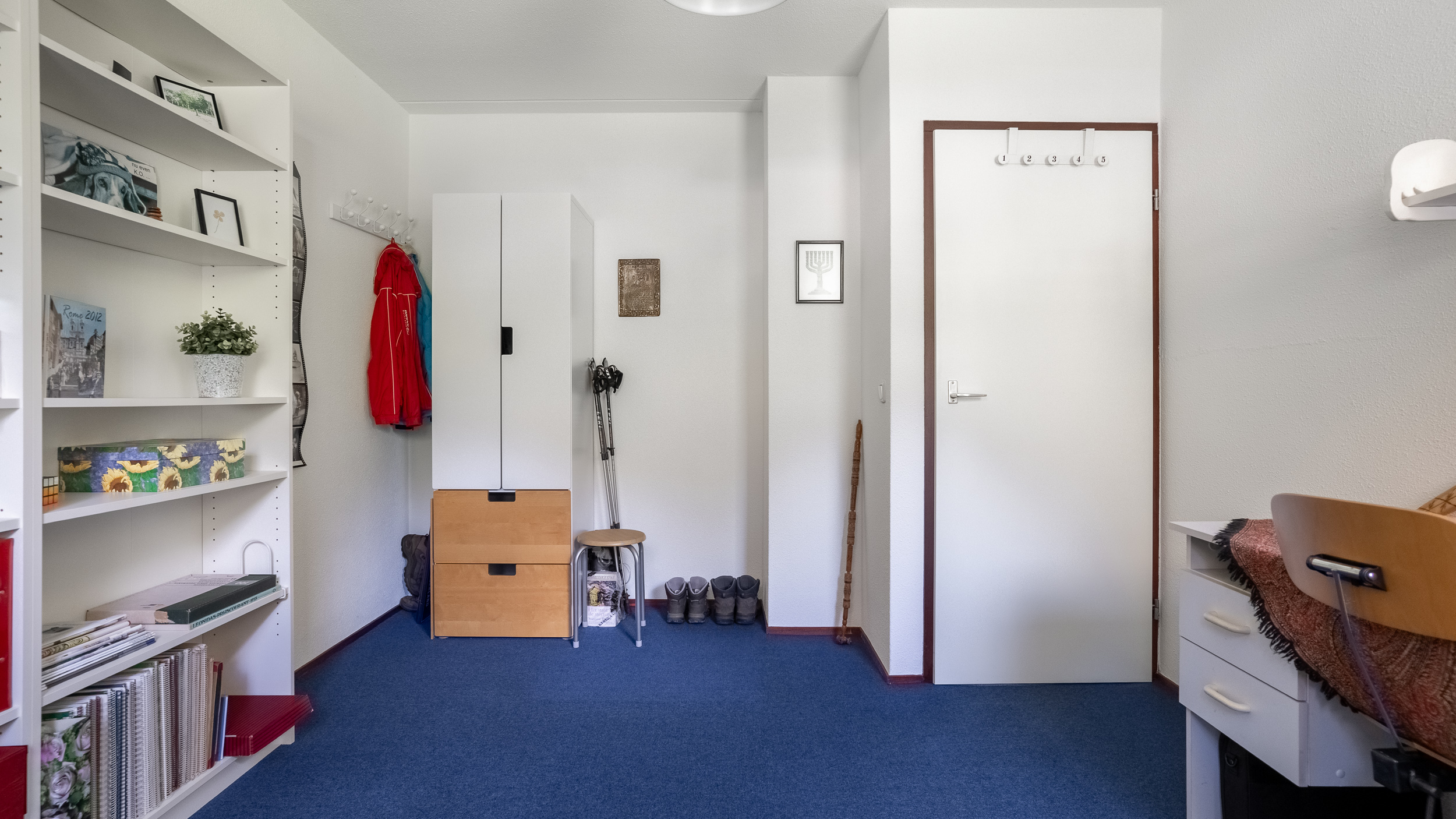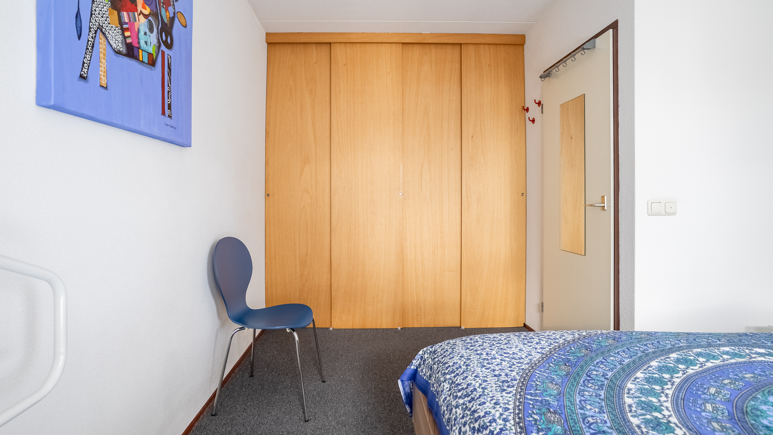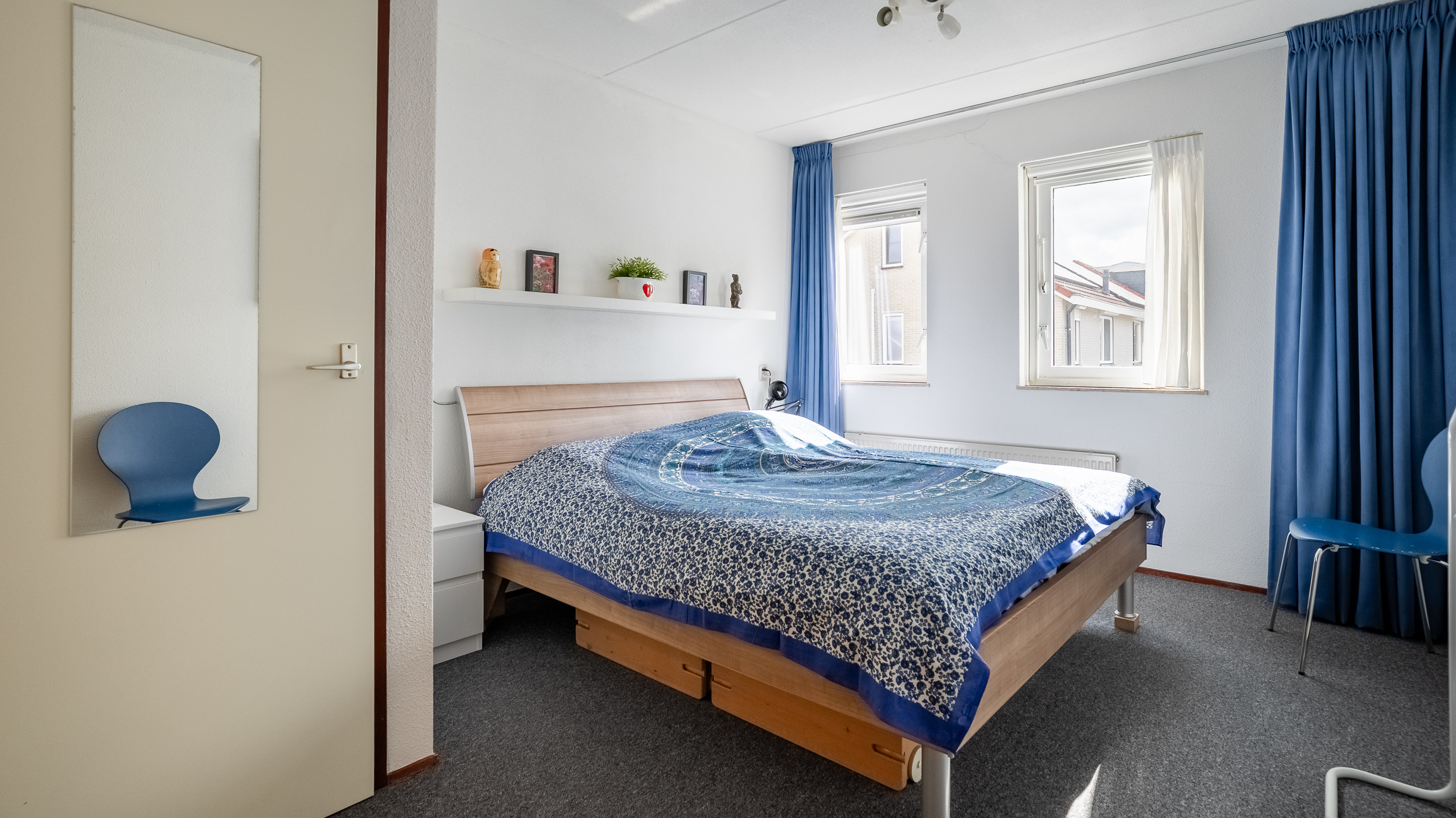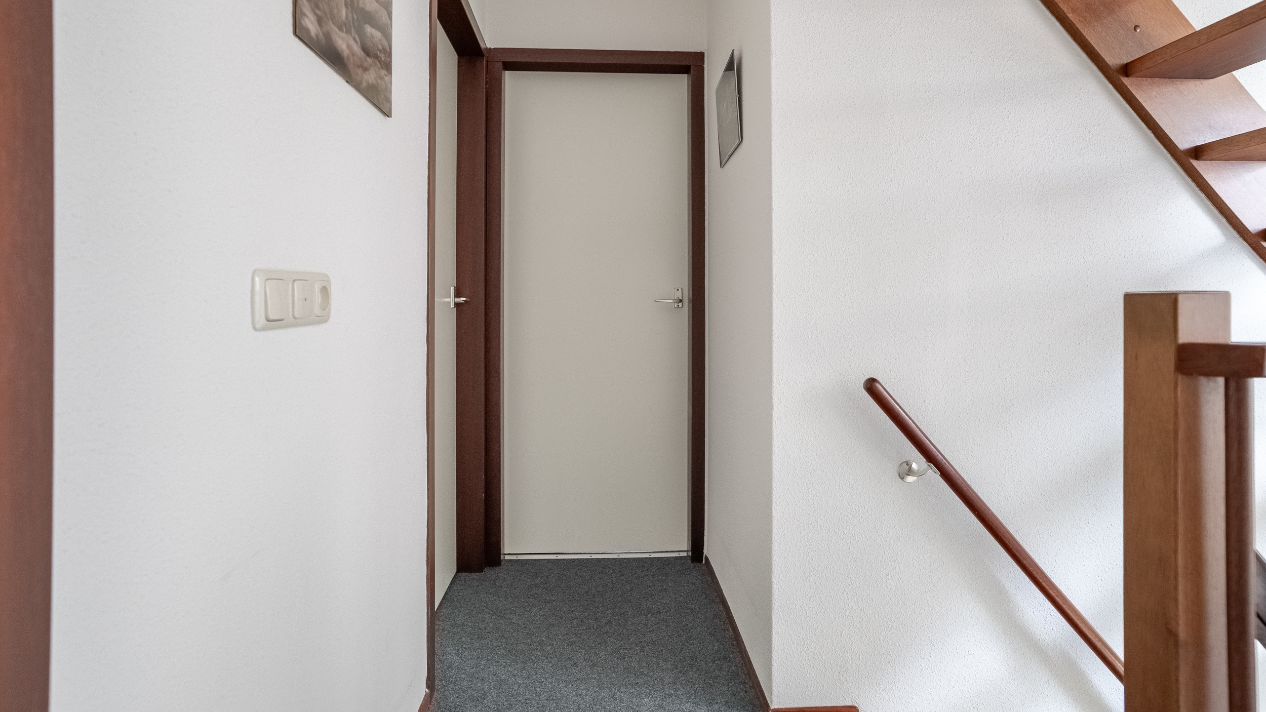 Overloop naar grote voorzolder met opstelplaats cv-ketel en witgoedapparatuur, ruime slaapkamer met vaste kast en voldoende bergruimte achter de schuine kanten.