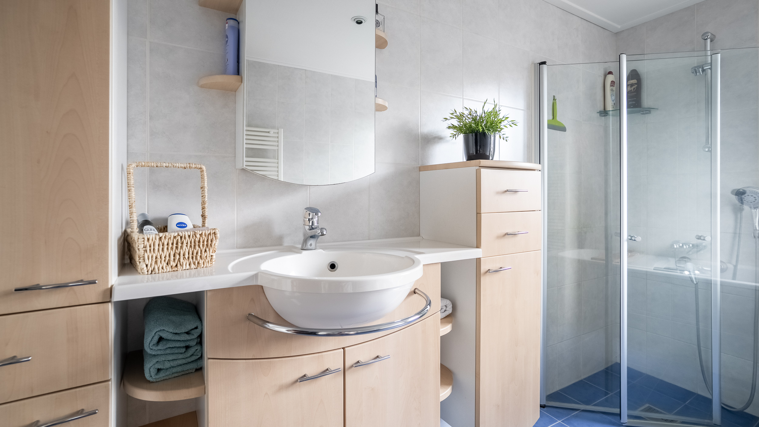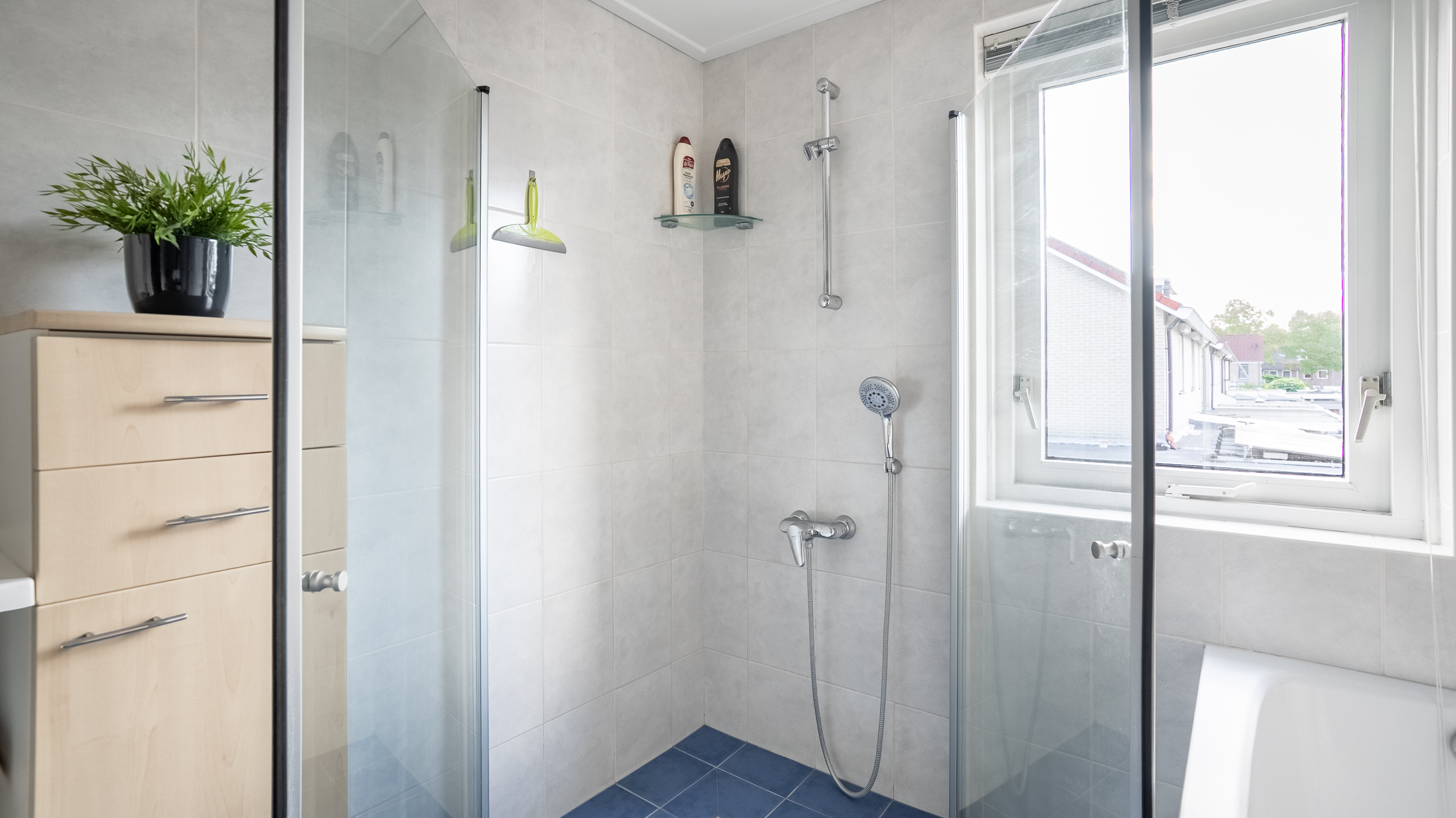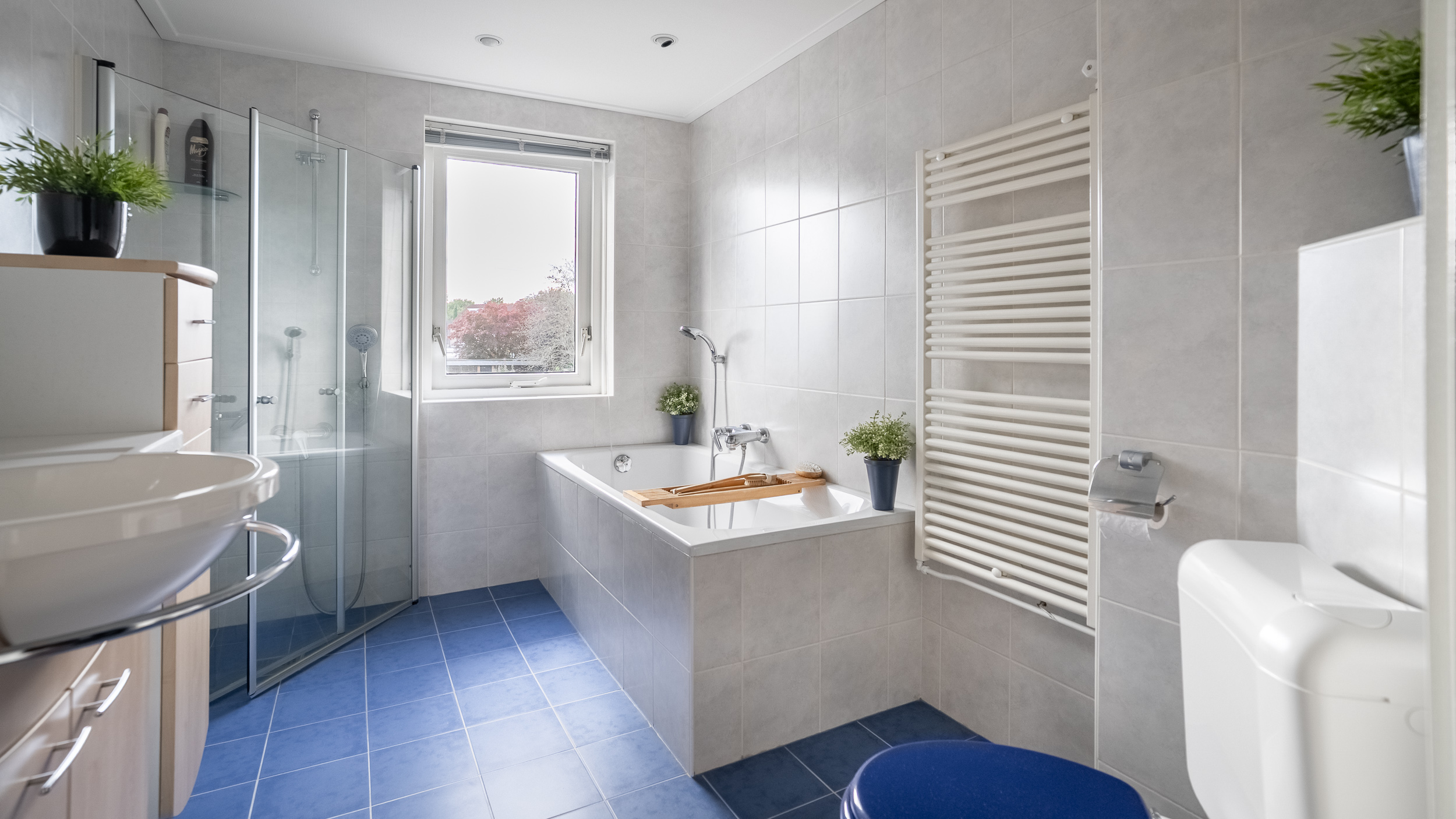 Overloop, drie royale slaapkamers waarvan de grootste slaapkamer voorzien is van een kastenwand, nette badkamer met wastafelmeubel, douche, toilet en ligbad.