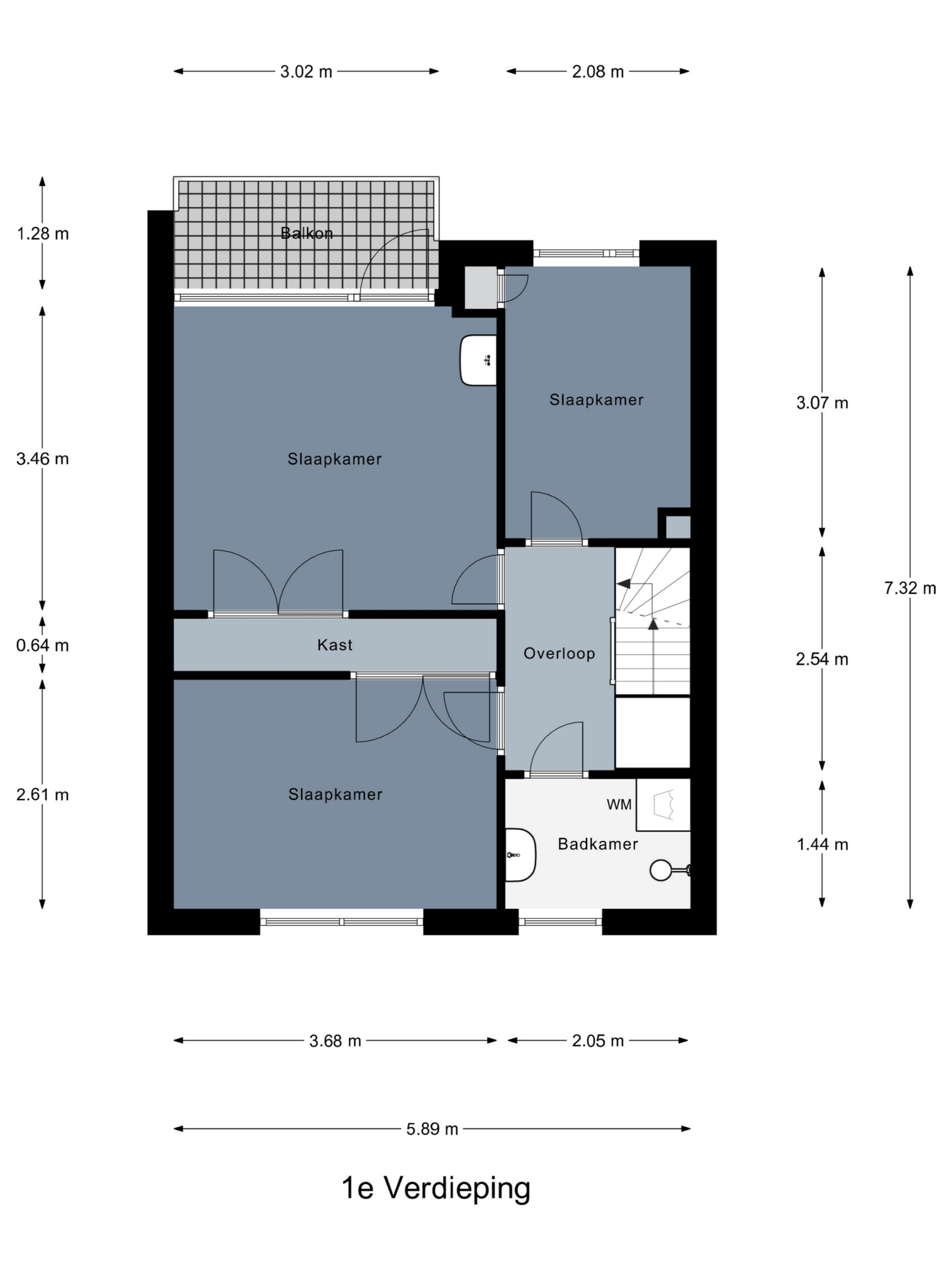 Overloop naar 3 ruime slaapkamers waarvan 2 kamers zijn voorzien van 2 inbouwkasten, 1 kamer heeft 1 inbouwkast. De grootste slaapkamer heeft een vaste wastafel en een balkon, met uitzicht op de achtertuin. De badkamer heeft een inloopdouche met wastafel en is voorzien van witgoedaansluitingen.